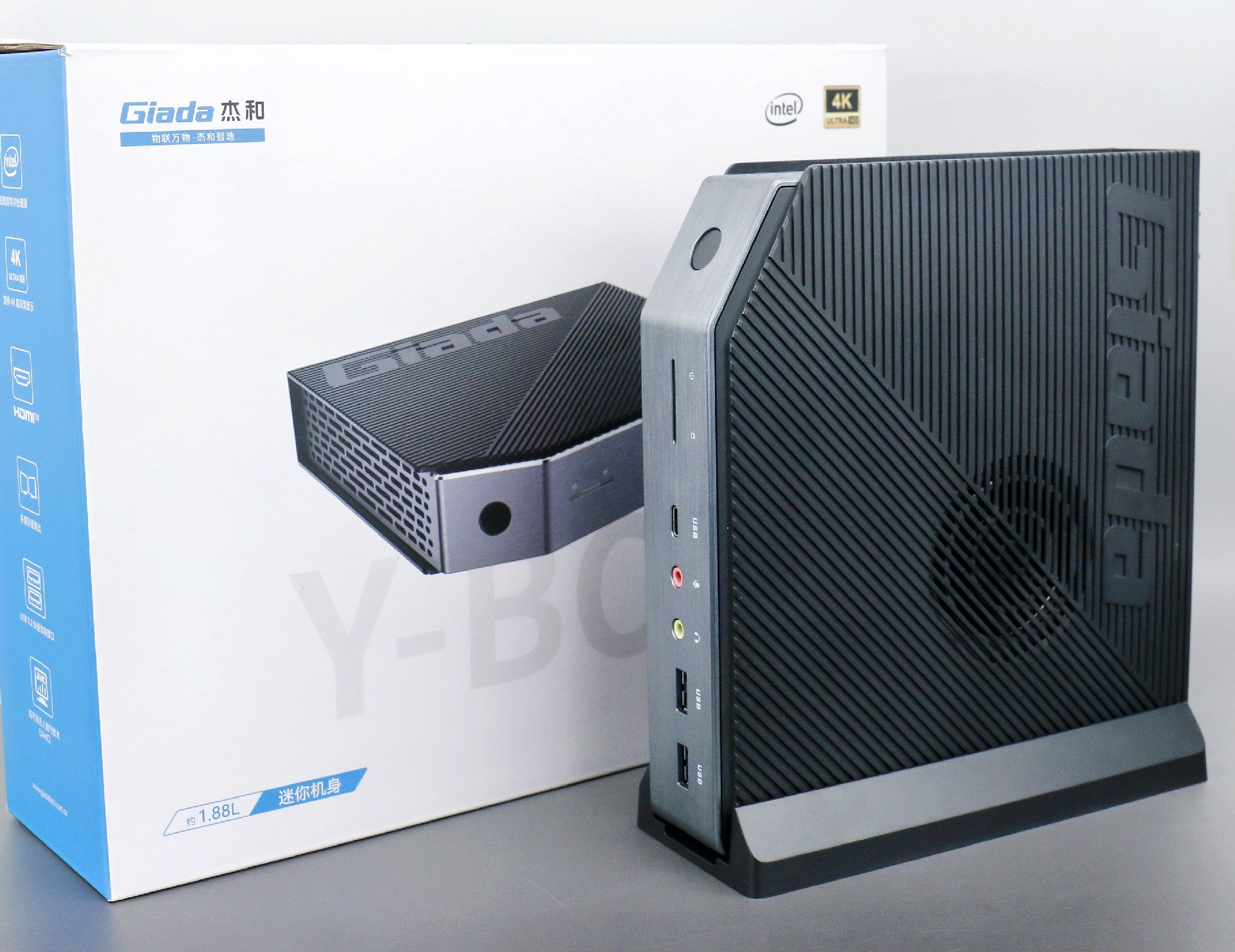 打开南宫NG·28(中国)相信品牌力量桌面云终端Y-BOX P3,你会发现它的结构并不是常见的四方体设计,而是在转角处好似被切割开一个角,切割出来的面积为指纹识别开机键。它的外观为优雅的银灰配色,机身正面厚重感十足,顶部依然沿用黑色哑光栅格并延伸至整机背面,磨砂塑胶材质壳,印刻南宫NG·28(中国)相信品牌力量Giada品牌名;其他三面则为银灰色,两侧是蜂窝式通风口设计。